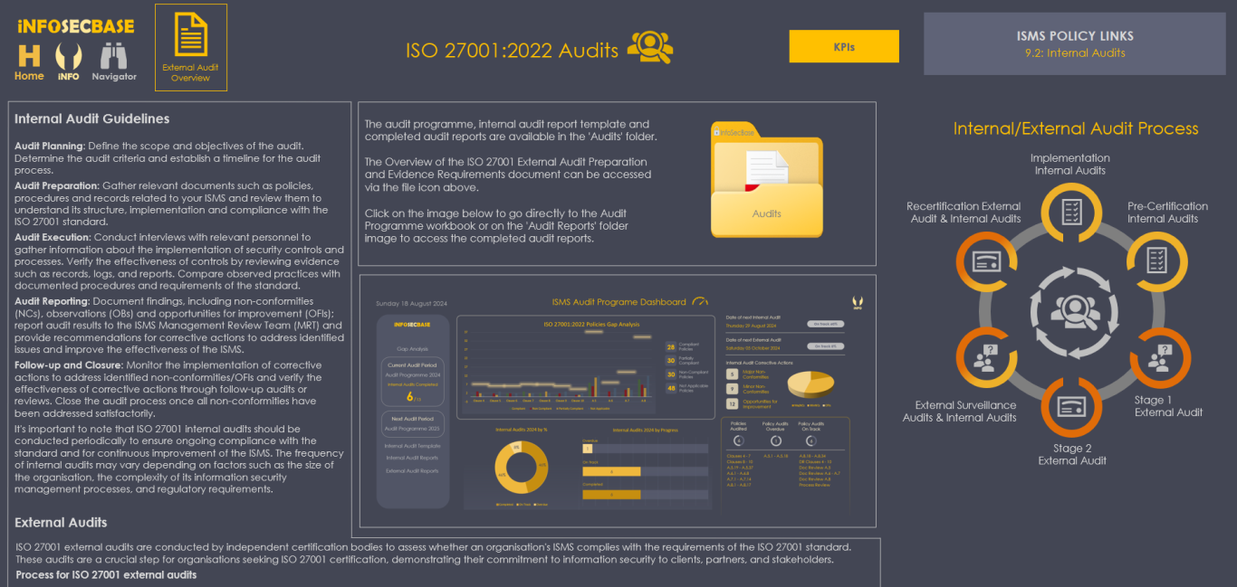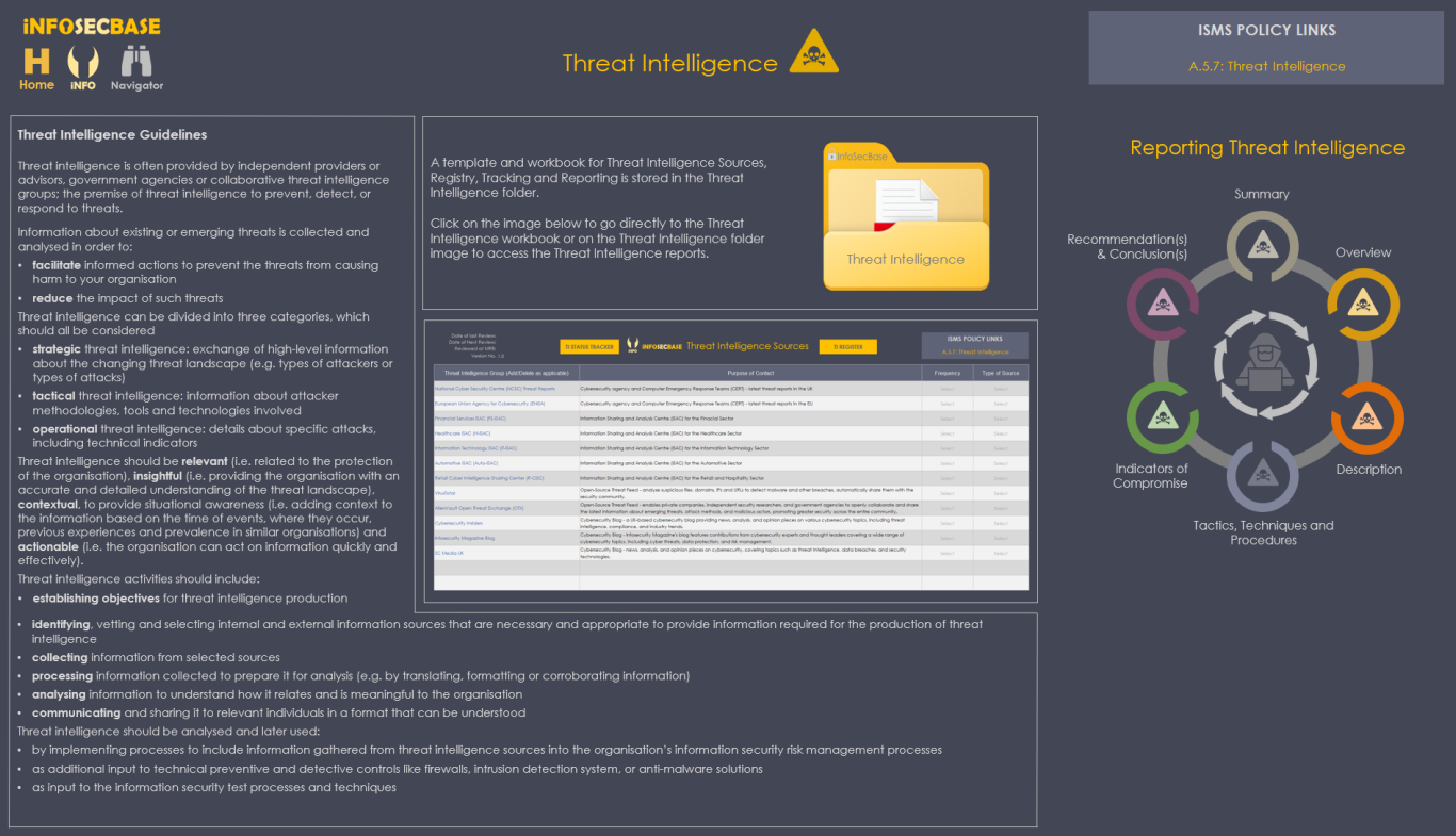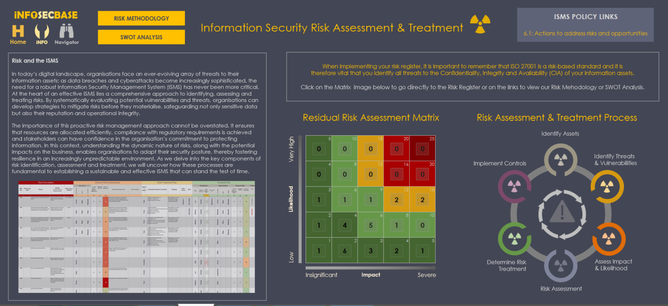 The InfoSecBase Navigator is your ISMS base of operations, from here you can plan and monitor your ISMS Implementation and manage your ISMS Team, ISO Requirements, Statement of Applicability, Risk Register, Interested Parties, Contact with Special Interest Groups and Authorities, Threat Intelligence, External and Internal Issues, Competencies, Information Security Objectives, Assets, Audits, Suppliers, Information Classification, Employee Training, Management Reviews, Corrective Actions and Improvements, Roles and Responsibilities, Communications, ISMS Performance Monitoring, Planning and Managing Change, Security Incident Management, Business Continuity Management and Data Management, you can also access the Document Tracker, your Help and Guidance documents and your ISMS Implementation Checklist. Within your ISMS Platform are numerous links to access all of your policies, documents, workbooks, tables and charts etc. - all are just a couple of clicks away!