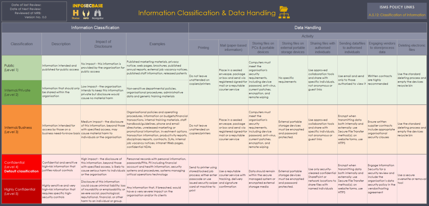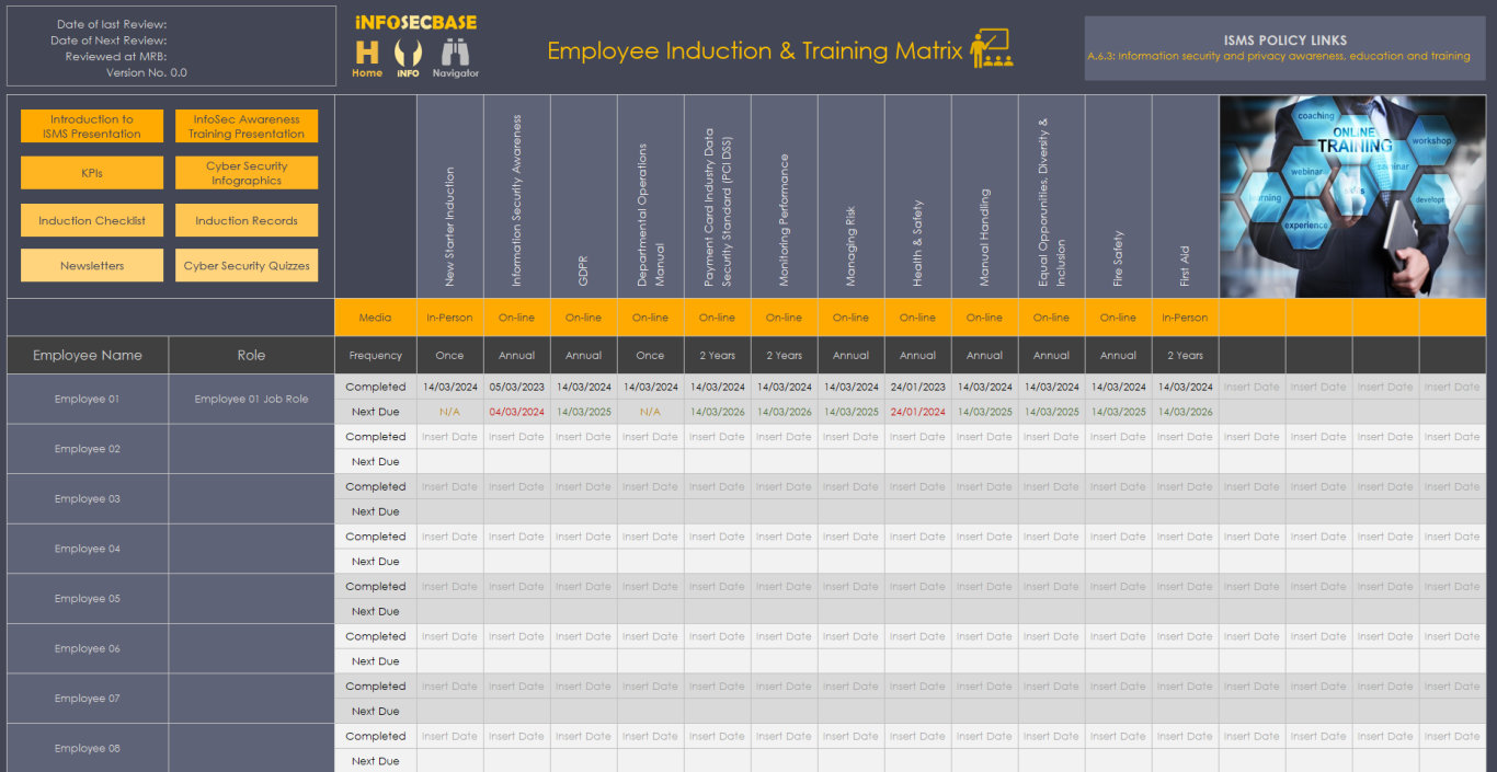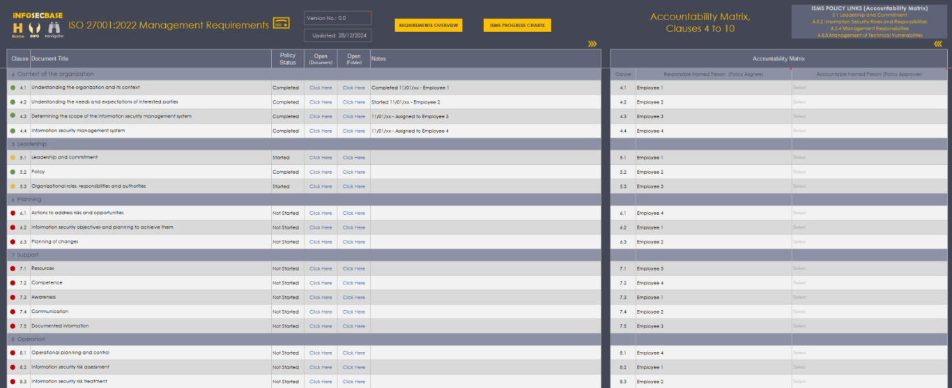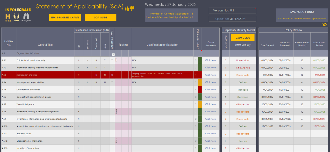 The InfoSecBase Navigator is your ISMS base of operations, from here you can plan and monitor your ISMS Implementation and manage your ISMS Team, ISO Requirements, Statement of Applicability, Risk Register, Interested Parties, Contact with Special Interest Groups and Authorities, Threat Intelligence, External and Internal Issues, Competencies, Information Security Objectives, Assets, Audits, Suppliers, Information Classification, Employee Training, Management Reviews, Corrective Actions and Improvements, Roles and Responsibilities, Communications, ISMS Performance Monitoring, Planning and Managing Change, Security Incident Management, Business Continuity Management and Data Management, you can also access the Document Tracker, your Help and Guidance documents and your ISMS Implementation Checklist. Within your ISMS Platform are numerous links to access all of your policies, documents, workbooks, tables and charts etc. - all are just a couple of clicks away!